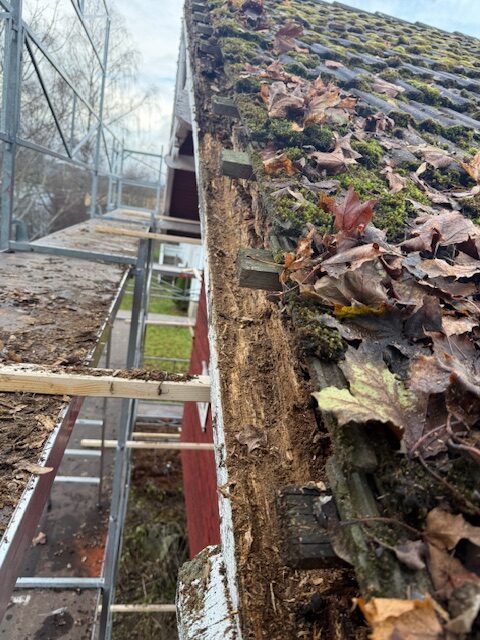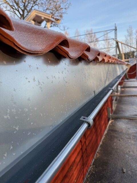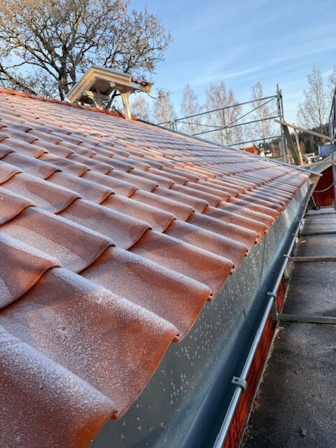 – Taket som lå der var på overtid. Det lå gammel teglstein på taket. I utgangspunktet var planen å gjenbruke gammel takstein. Det viste seg at denne ikke var god nok for gjenbruk. Vi har fjernet alt av gammelt tak og blikk, skiftet ut råte og bygget opp taket med ny enkeltkrum teglstein. Det er benyttet sinkmagnesium i takrenner og beslag for å gi tidsriktig utseende på bygget. Med nytt tak står stabburet tørt og fint i mange år framover, sier Kay Pettersen i Terje Pettersen As.